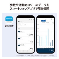 Bluetooth通信機能を搭載。iPhone/Android専用アプリ「OMRON connect(オムロン コネクト)」に、 測定データを転送し、歩数や総消費カロリー、早歩き歩数などの測定データを簡単に確認・管理することができます。