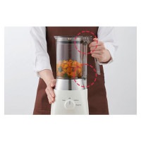 また、ステンレス素材にブラックチタンをコーティングした「ギザ刃」「平刃」「波刃」の3種の形状の刃を組み合わせたブラックチタンコート6枚刃で、砕き残りが起こりやすい人参などのかたい食材や角氷もかんたんに細かく粉砕します。食材のおいしさや栄養はそのままに、なめらかな食感に仕上げます。